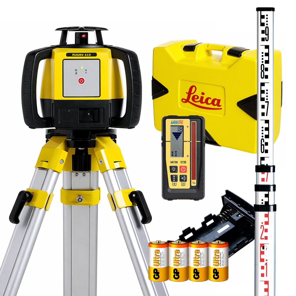 Leica Rugby 610 rotasjonslaser pakke med mm-mottaker, stativ og stang