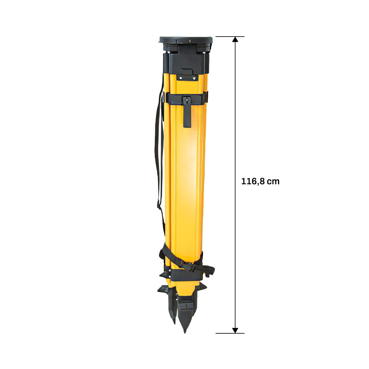 Stativet er utstyrt med kombinerte klemmer og skrulås for rask oppsett og sikker låsing av bena. Den kraftige konstruksjonen gjør stativet velegnet for krevende feltforhold, samtidig som høyden enkelt kan justeres for nøyaktig instrumentplassering.